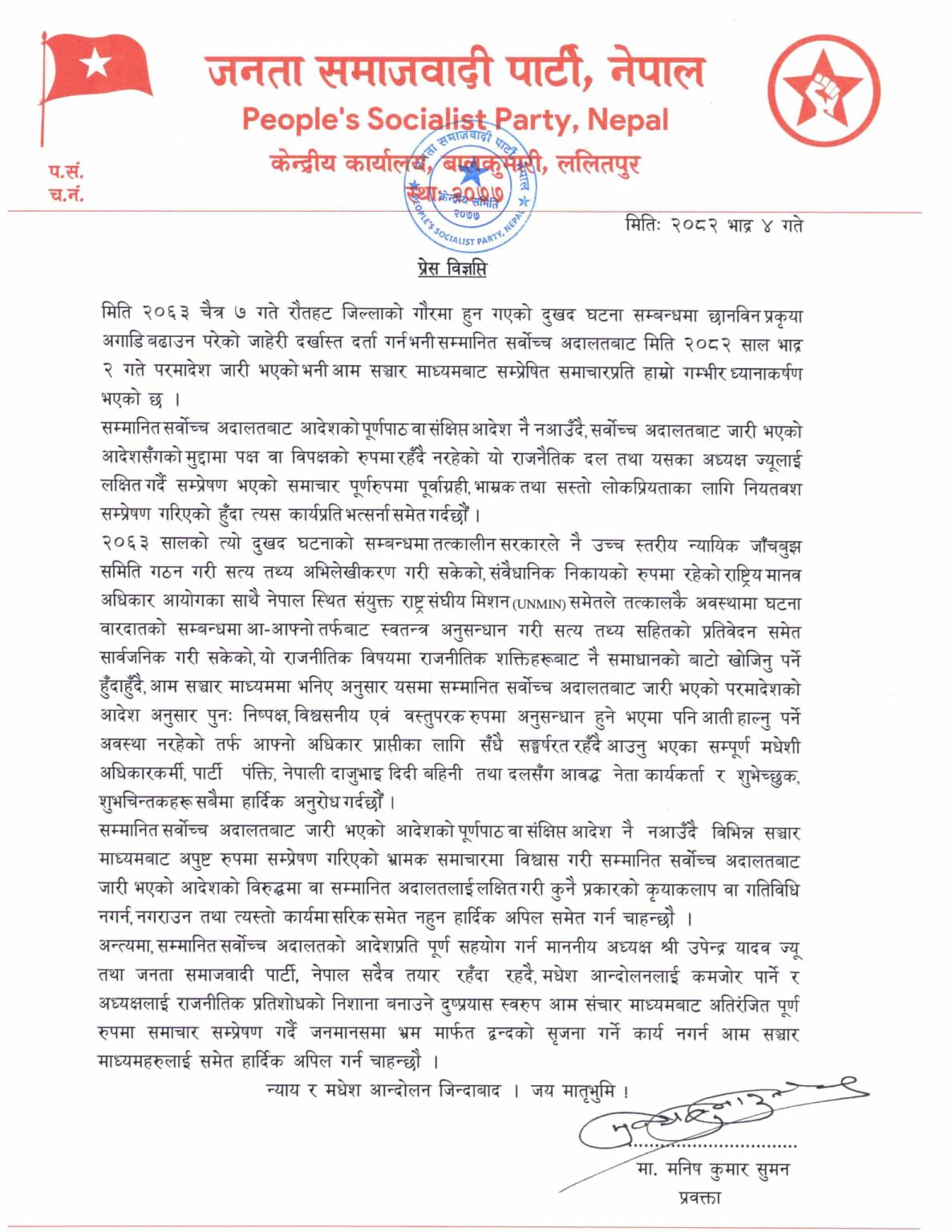 २०६३ चैत्र ७ गते रौतहट जिल्लाको गौरमा भएको घटनामा परेको मुद्धामा सर्वोच्च अदालतले दुईदिन अघि (भदौ २) मा छानबिन अघि बढाउन सुरक्षा निकायलाई आदेश दिएको थियो । ‘सर्वोच्च अदालतबाट आदेशको पूर्णपाठ वा संक्षिप्त आदेश नै नआउँदै सर्वोच्च अदालतबाट जारी भएको आदेशसँगको मुद्दामा पक्ष वा विपक्षको रुपमा रहँदै नरहेको यो राजनैतिक दल तथा यसका अध्यक्ष ज्यूलाई लक्षित गर्दै सम्प्रेषण भएको समाचार पूर्णरुपमा पूर्वाग्रही, भाम्रक तथा सस्तो लोकप्रियताका लागि नियतवश सम्प्रेषण गरिएको’, जसपा नेपालले निकालेको विज्ञप्तिमा उल्लेख छ ।