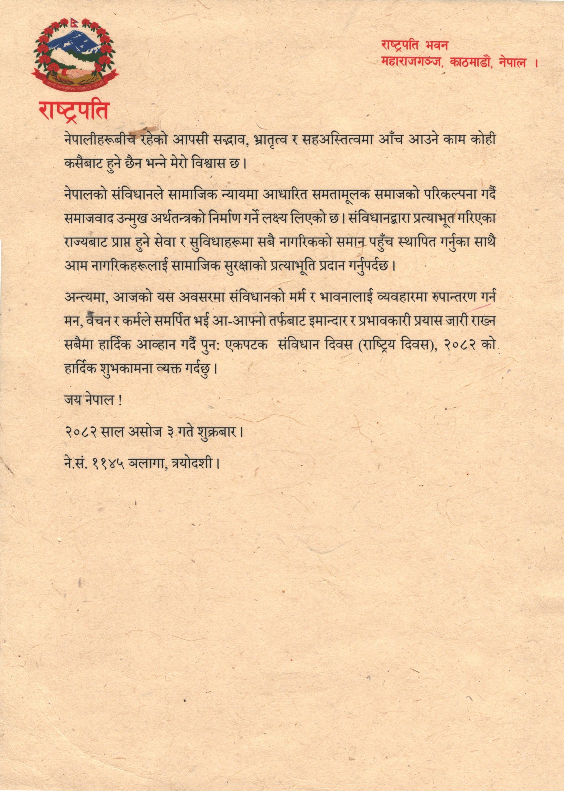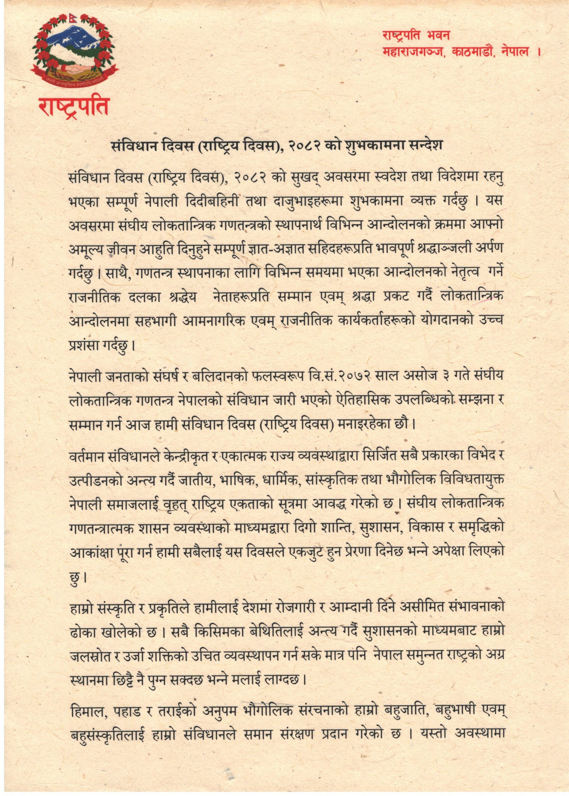 राष्ट्रपति पौडेलले संविधानको मर्म र भावनालाई व्यवहारमा रूपान्तरण गर्न मन, वचन र कर्मले समर्पित भई आ-आफ्नो तर्फबाट इमान्दार र प्रभावकारी प्रयास जारी राख्न सबैमा आह्वान गरेका छन्।