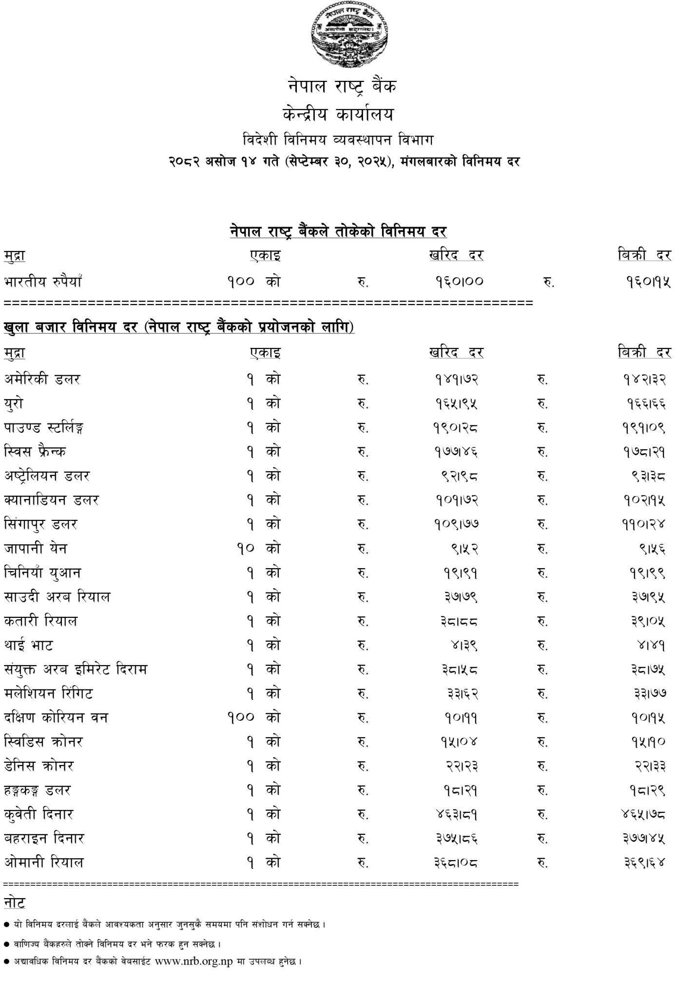 वाणिज्य बैंकले तोक्ने विनिमय दर भने फरक हुनसक्ने र अद्यावधिक विनिमय दर केन्द्रीय बैंकको वेबसाइटमा उपलब्ध हुने जनाइएको छ ।