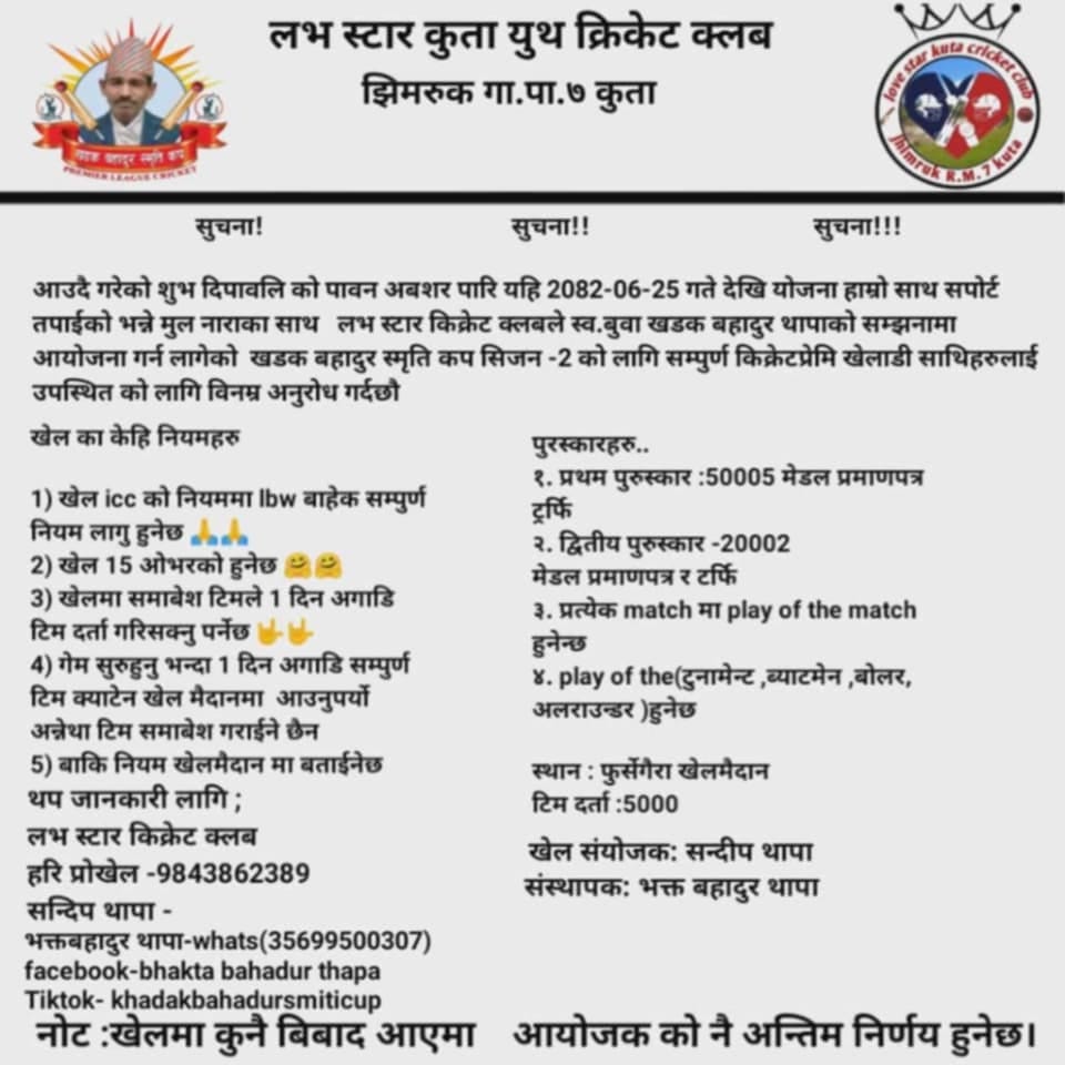 आउदै गरेको शुभ दिपावलि को पावन अवसर पारि यहि २०८२-६-२५ गते देखि सुरु हुने गरि `योजना हाम्रो साथ सर्पोट तपाईको´ भन्ने मुल नाराका साथ लभ स्टार किक्रेट क्लबले स्व.बुवा खडक बहादुर थापाको सम्झनामा खड्क बहादुर स्मृति कप सिजन-२ आयोजना गर्ने भएको हो ।