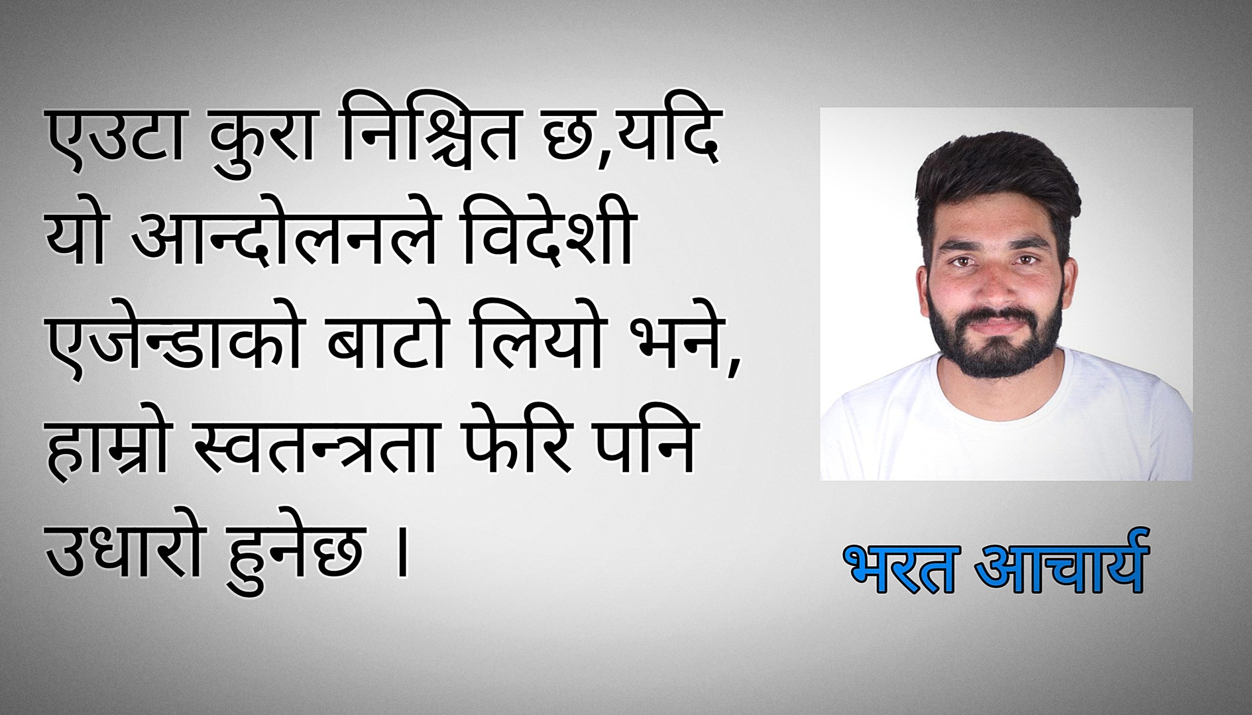 नेपालमा परिवर्तनको नाममा हरेक दस वर्षमा नयाँ आन्दोलन हुन्छ। तर प्रत्येक आन्दोलनपछि जनताका सपना सत्ताको कुर्सीमा थिचिन्छन्। २०१७ सालमा प्रजातन्त्र आयो, २०४६ मा बहुदल, २०६२/६३ मा गणतन्त्र — तर जनताको जीवनमा खासै केही फरक आएन। त्यसैले यो पुस्ताले भनेको छ अब पुरानो सोच चाहिँदैन। तर जब सोचको विकल्प पनि विदेशले लेखिदिन्छ, त्यो क्रान्ति होइन, निर्देशनमा भएको नाटक मात्र हुन्छ। साँच्चिकै परिवर्तन चाहिन्छ भने, देशको प्रणालीभित्र नै सुधार गर्नुपर्छ । न्यायपालिका स्वतन्त्र बनाउने, शिक्षा र स्वास्थ्यलाई समान बनाउने,र भ्रष्टाचारलाई कानुनी रूपमा अन्त्य गर्ने। तर अहिले भइरहेको आन्दोलनमा यी विषय गुमेका छन्।