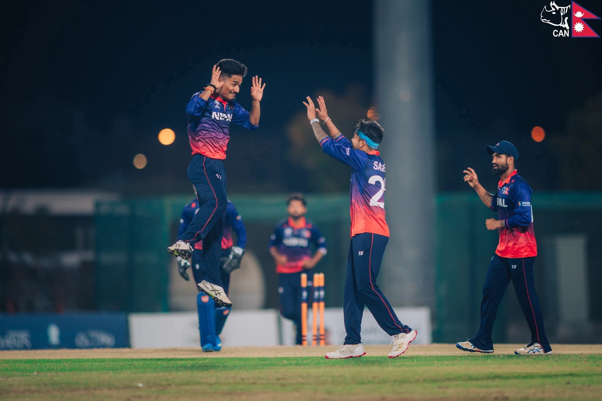 अमिर कलिमलाई दीपेन्द्रसिंह ऐरीले सिधा थ्रोमा १ रनमा रनआउट गरे। दीपेन्द्रले लगातार पाँचौं खेलमा सिधा थ्रोमा रनआउट गरे। आर्यन विष्टले २४ बलमा११ रन बनाए।