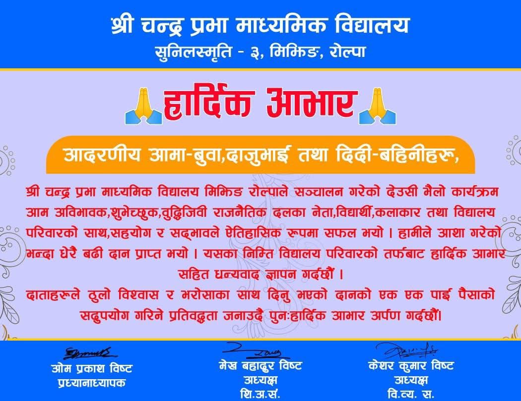 श्री चन्द्रप्रभा माध्यमिक विद्यालय, मिझिङले तिहारको अवसरमा आयोजना गरेको भैलो तथा सहयोगात्मक सांस्कृतिक कार्यक्रममा ३६ लाख ९४ हजार ८ सय २ रुपैयाँ संकलन भएको छ।