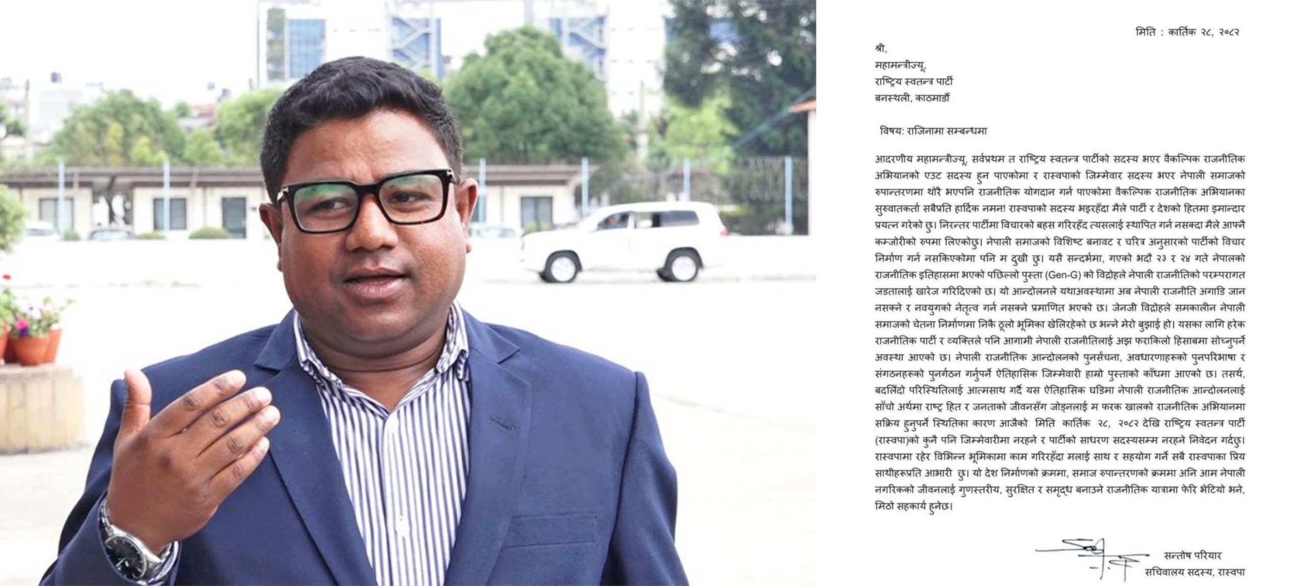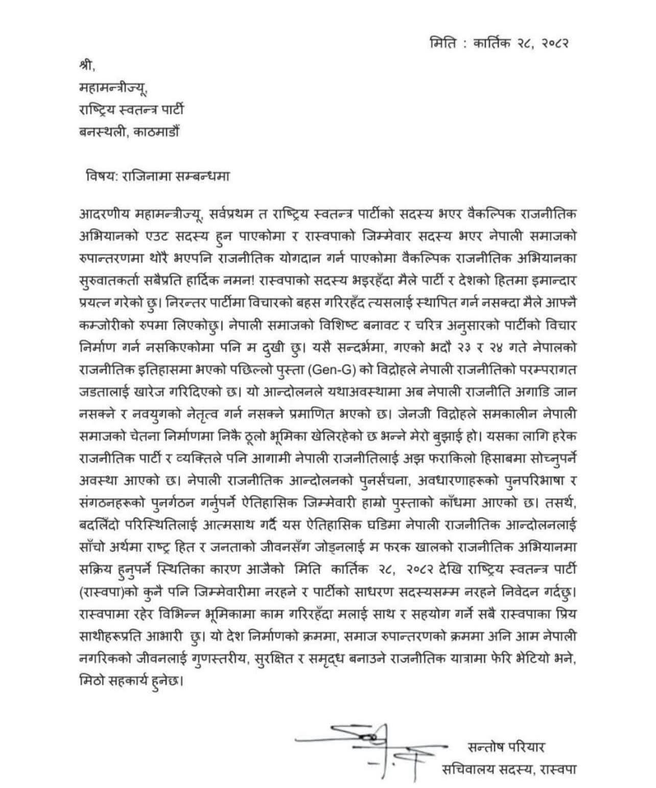 परियारले आजै कार्यवाहक सभापति डीपी अर्याल र महामन्त्री कवीन्द्र बुर्लाकोटीलाई राजीनामा पत्र बुझाएको रास्वपा स्रोतले जनाएको छ ।