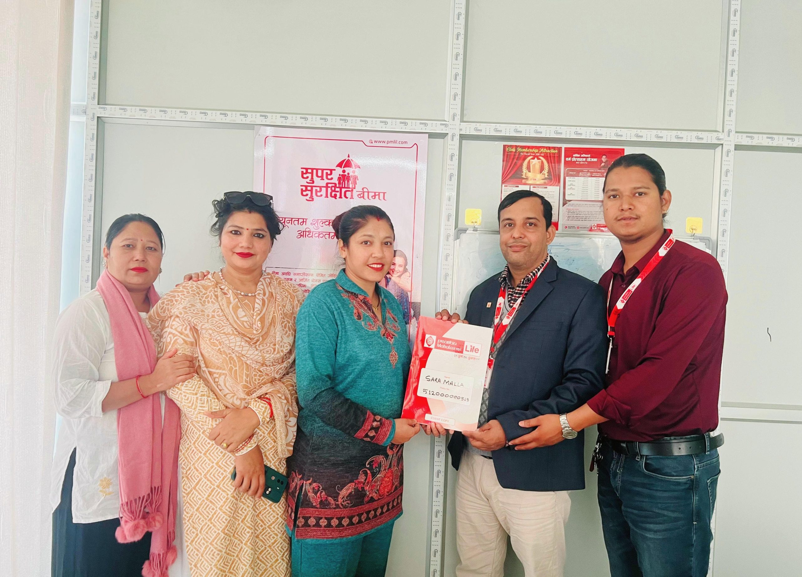मुर्गिया शाखाका शाखा प्रमुख श्री ऋषिराम चुदाली ,कर्मचारी निश्चल बस्नेत , सिनियर एजेन्सी म्यानेजर बिष्णुमाया चन्द र मिना न्यौपानेको उपस्थितिमा सो बिमा पोलिसी मिना पोखरेल मल्ल मार्फत छोरी सारा मल्ललाई दिइयो।