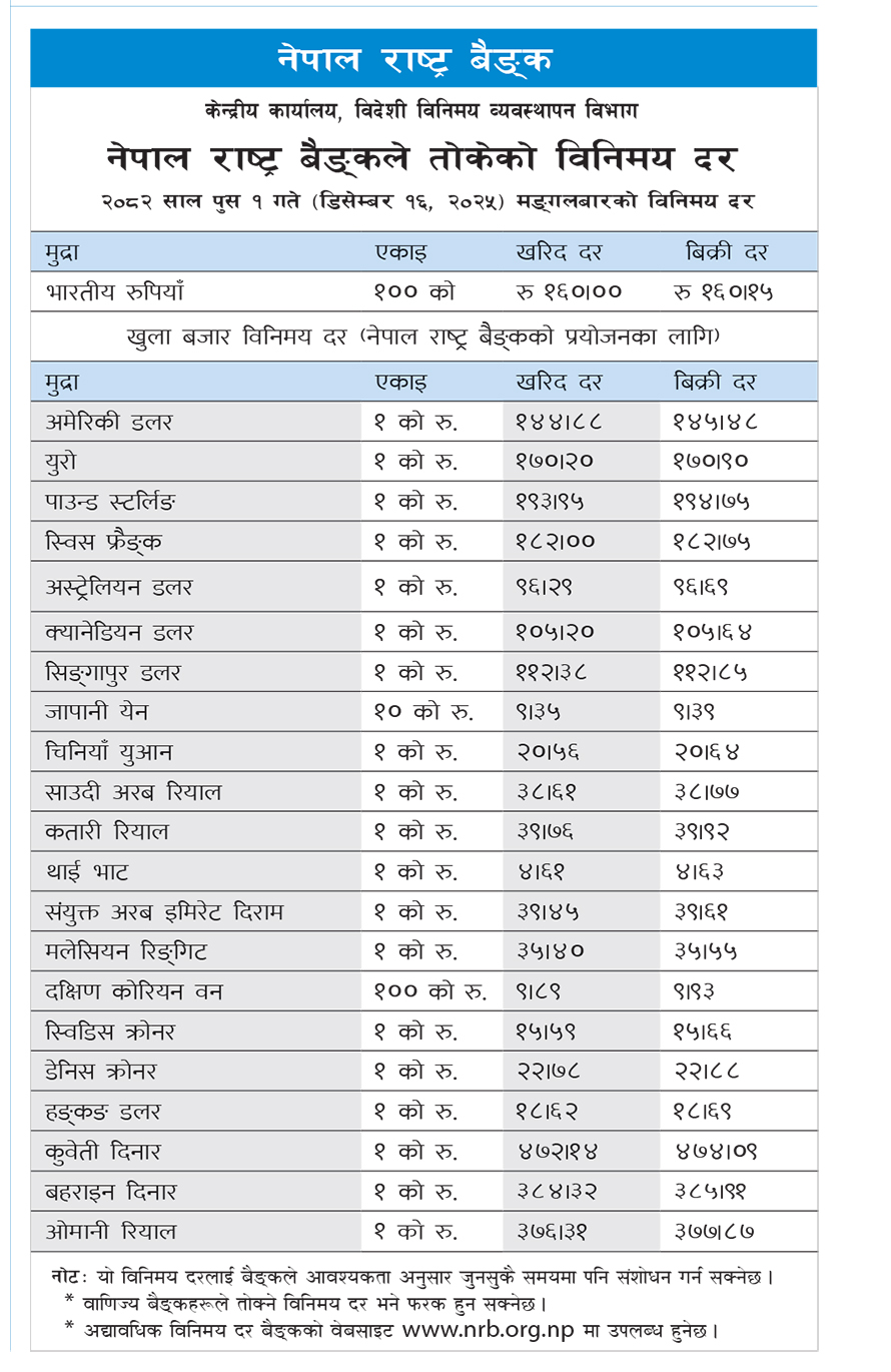 वाणिज्य बैंकले तोक्ने विनिमयदर भने फरक हुनसक्ने र अद्यावधिक विनिमयदर केन्द्रीय बैंकको वेबसाइटमा उपलब्ध हुने जनाइएको छ।
