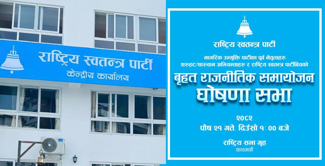राष्ट्रिय स्वतन्त्र पार्टी (रास्वपा)ले सोमबार बृहत राजनीतिक समायोजन घोषणा सभा गर्दैछ ।