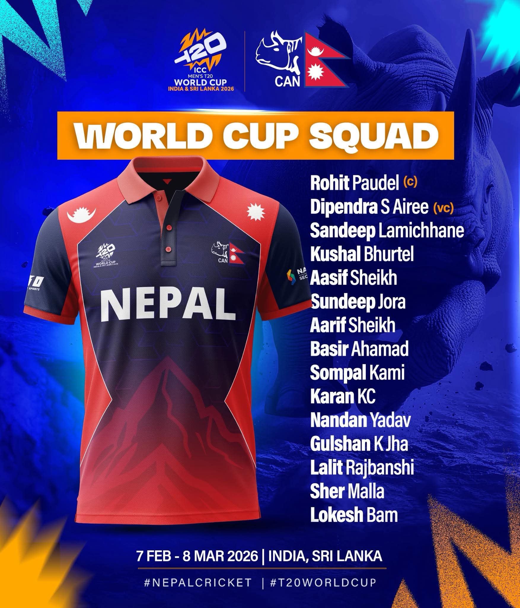 भारत र श्रीलंकामा संयुक्त रूपमा हुने आईसीसी टी-२० विश्वकप २०२६ का लागि नेपालको १५ सदस्यीय टोली घोषणा भएको छ ।