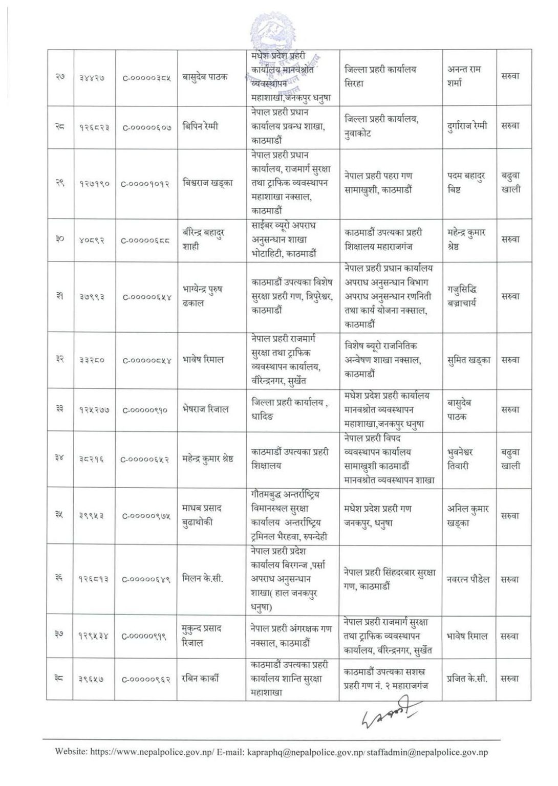 एसपीहरु अनन्तराम शर्मा, अनिल कुमार खड्का, अमरेन्द्रबहादुर सिंह, अर्जुन प्रसाद तिमिल्सिना, एक नारायण कोइराला, काजी कुमार आचार्य, कुलदीप चन्द, केशव भट्टराई, गजुसिद्धी बज्राचार्य, गौतम मिश्र लगायतको सरुवा भएको छ ।