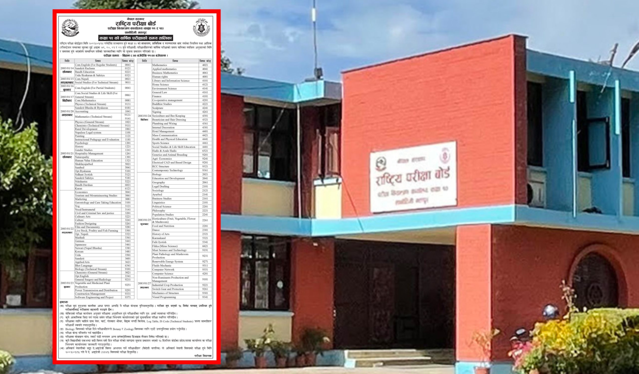 कक्षा १२ को वार्षिक परीक्षा तालिका सार्वजनिक भएको छ । राष्ट्रिय परीक्षा बोर्डले आज परीक्षा तालिका सार्वजनिक गरेको हो ।