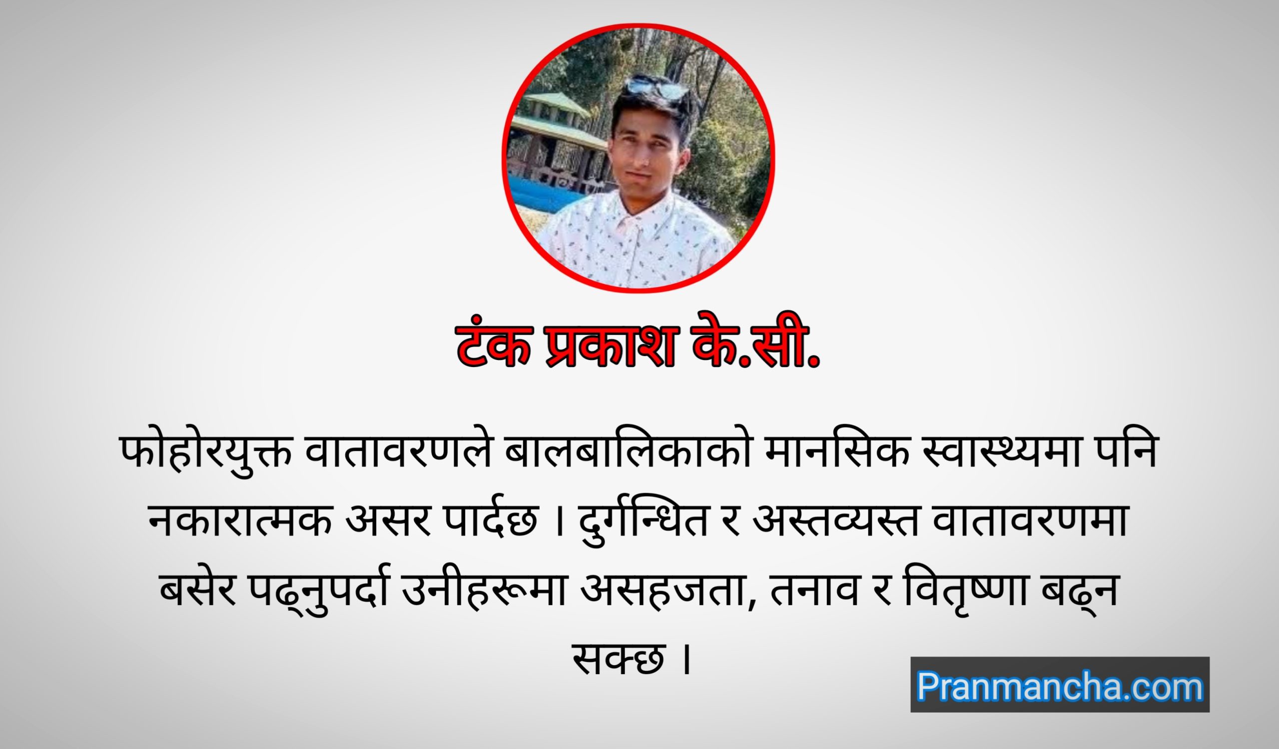फोहोरयुक्त वातावरणले बालबालिकाको मानसिक स्वास्थ्यमा पनि नकारात्मक असर पार्दछ । दुर्गन्धित र अस्तव्यस्त वातावरणमा बसेर पढ्नुपर्दा उनीहरूमा असहजता, तनाव र वितृष्णा बढ्न सक्छ । यस्तो वातावरणले ध्यान केन्द्रित गर्न कठिन बनाउँछ, जसले सिकाइ क्षमतामा कमी ल्याउँछ ।