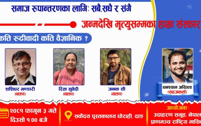 ३० माघ, घोराही दाङको घोराईमा आउँदो शनिबार जन्मदेखि मृत्युसम्मका संस्कारबारे एक महत्वपूर्ण विमर्श आयोजना हुन लागेको छ। “समाज रूपान्तरणका लागि: सबै सँधै र सँगै” भन्ने मूल मन्त्रका साथ विगत एक दशकदेखि विभिन्न कार्यक्रमहरू सञ्चालन गर्दै आएको...