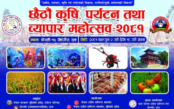 पुरा पढ्नुहोस११ फागुन, दाङ दाङ जिल्ला उद्योग वाणिज्य संघको आयोजनामा घोराहीमा फागुन २ गतेदेखी जारी महोत्सवमा कृषि तथा पर्दशनीका स्टलहरुलाई प्राथमीकता दिईएको छ । ‘उद्योग व्यापार कृषि एवं पर्यटनको विकास, परनिर्भरमुखि अर्थतन्त्रको निकास’ भन्ने मूल नारासाथ आयोजना...