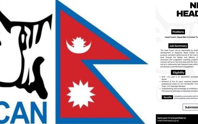 ३ फागुन, काठमाडौं नेपाल क्रिकेट संघ (क्यान)ले पुरूष राष्ट्रिय क्रिकेट टिमको मुख्य प्रशिक्षकका लागि आवेदन खुलाएको छ । क्यानले शनिबार सूचना निकाल्दै आवेदन खुलाएको हो । क्यानले ईसीबी वा क्रिकेट अस्ट्रेलियाको लेभल ३ वा सो सरहको...