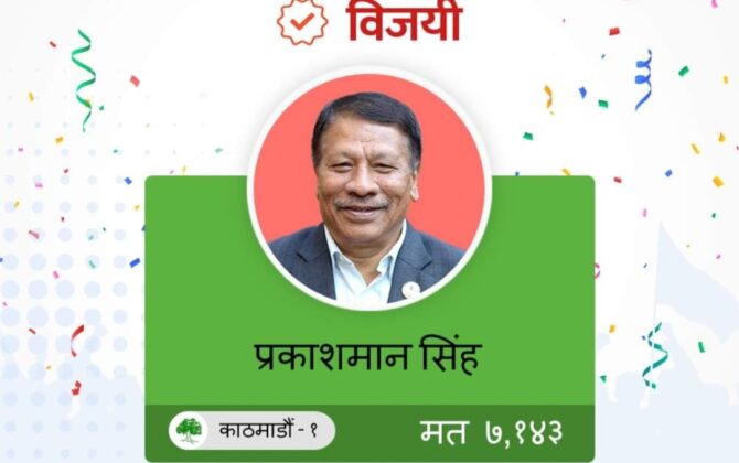 काठमाडौँ । काठमाडौँ क्षेत्र नं १ बाट प्रतिनिधिसभा सदस्यमा नेपाली कांग्रेसका प्रकाशमान सिंह विजयी भएका छन् । सिंहले प्रतिद्वन्द्वी राष्ट्रिय प्रजातन्त्र पार्टीका रबीन्द्र मिश्रलाई १ सय २९ मतले पराजित गरे। सिंहले सात हजार एक सय...