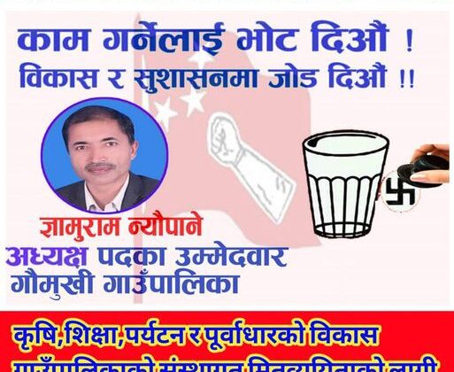 यही वैशाख ३० गते हुन गइरहेको गौमुखी गाउँपालिकाको दोश्रो निर्वाचनमा मेरो गाउँपालिका अध्यक्ष पदमा उम्मेदवारी रहेको छ। केही व्यक्तिगत र केही सामाजिक काम गर्दै यही गौमुखीको सेरोफेरोमा मेरो ५२ बर्षको उमेर बितिसकेको छ। हरेक...