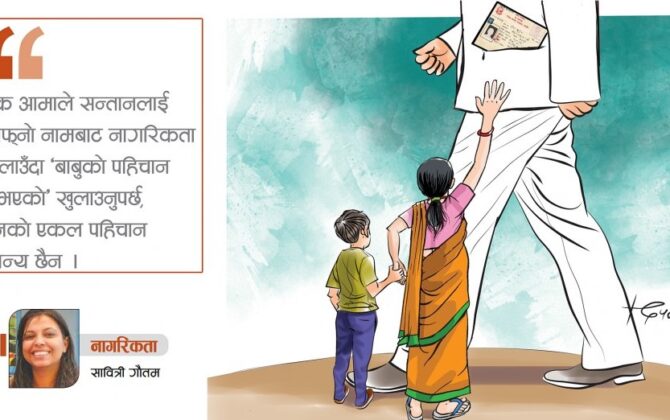 यतिबेला मेरो नागरिकता हराएको छ । प्रतिलिपि निकाल्नुपर्नेछ । मैले निकाल्दाताकाको नागरिकता प्रमाणपत्रमा झन् ‘आमाको नाम’ भन्ने कोठै हुँदैनथ्यो । साथीहरूबाट सुनेको छु, नयाँ नागरिकता प्रमाणपत्रमा ‘आमाको नाम’ भन्ने कोठामा सीडीओ कार्यालयका कर्मचारीले आमाको नाम लेखिदिँदैनन् ।...
