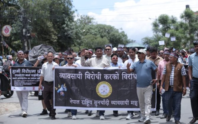 पुरा पढ्नुहोस१९ असार, काठमाडौं नेपाल सुनचाँदी रत्न तथा आभूषण महासंघ र नेपाल सुनचाँदी व्यवसायी महासंघ पुनः सडक आन्दोलनमा उत्रिएका छन् । सुनमा लगाइएको २ प्रतिशत विलासिता कर र बहुमूल्य हिरा पत्थरमा १३ प्रतिशत भ्याट खारेज गर्न, सुनको...