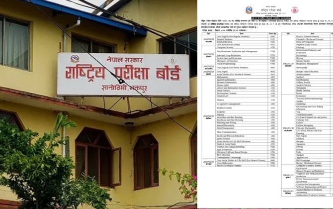 पुरा पढ्नुहोस१० वैशाख, काठमाडौँ राष्ट्रिय परीक्षा बोर्डले वैशाख २१ गतेदेखि हुने कक्षा-१२ को परीक्षा तालिका सार्वजनिक गरेको छ। परीक्षा बोर्डले आज परीक्षा तालिका सार्वजनिक गरेको हो। परीक्षा तालिकाअनुसार परीक्षा बिहान ८ बजेदेखि ११ बजेसम्म सञ्चालन हुनेछ। परीक्षा...