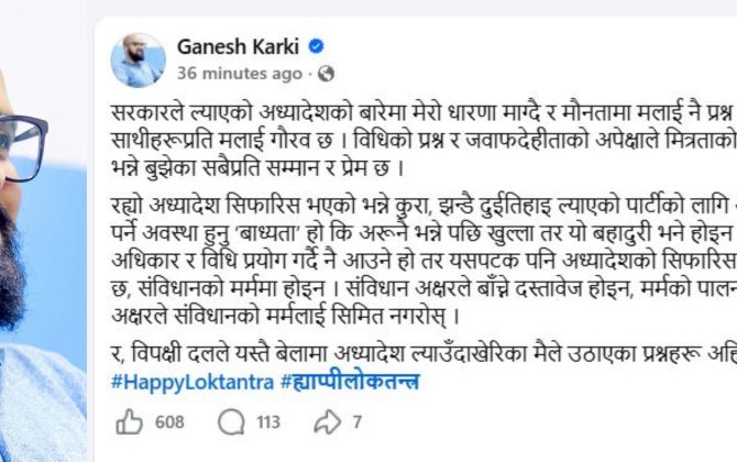 १६ वैशाख, काठमाडौं राष्ट्रिय स्वतन्त्र पार्टी (रास्वपा)का प्रतिनिधिसभा सदस्य गणेश कार्कीले सरकारको आलोचना गरेका छन् । संसद छलेर अध्यादेश ल्याएपछि कार्कीले आफ्नै दलकै सरकारको आलोचना गरेका हुन् । झन्डै दुई तिहाईको सरकारले अध्यादेश ल्याउनु बहादुर नभएको...