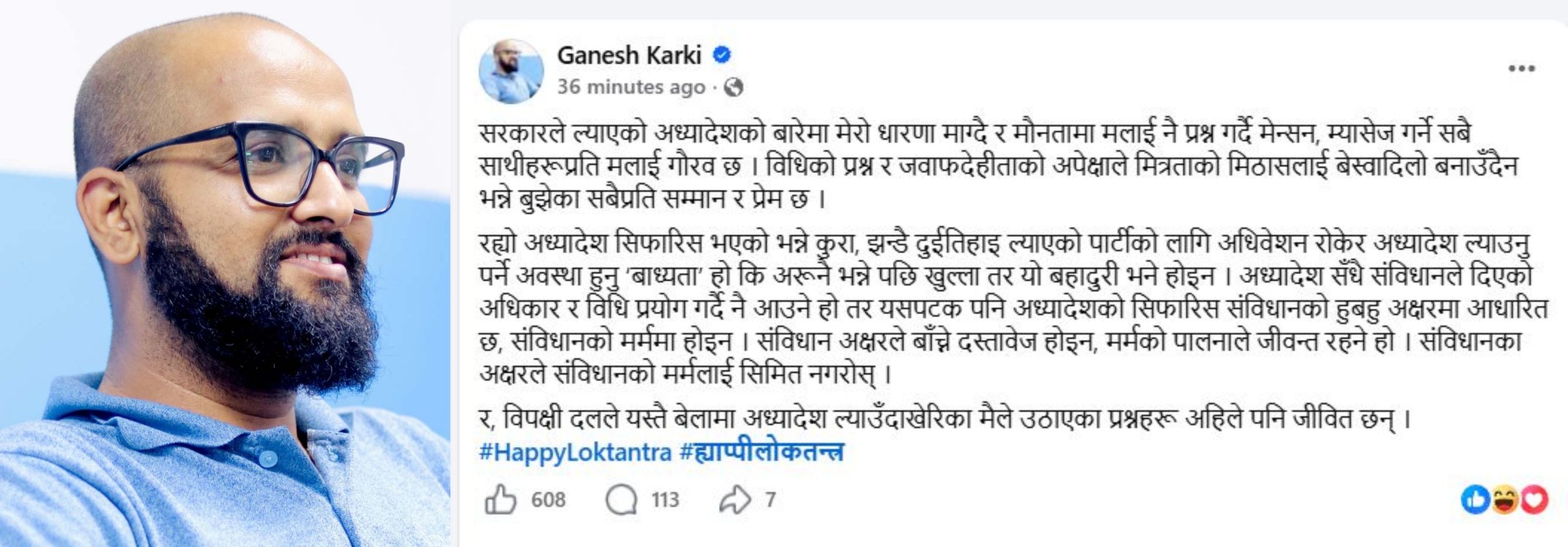 १६ वैशाख, काठमाडौं राष्ट्रिय स्वतन्त्र पार्टी (रास्वपा)का प्रतिनिधिसभा सदस्य गणेश कार्कीले सरकारको आलोचना गरेका छन् । संसद छलेर अध्यादेश ल्याएपछि कार्कीले आफ्नै दलकै सरकारको आलोचना गरेका हुन् । झन्डै दुई तिहाईको सरकारले अध्यादेश ल्याउनु बहादुर नभएको उनको टिप्पणी छ...